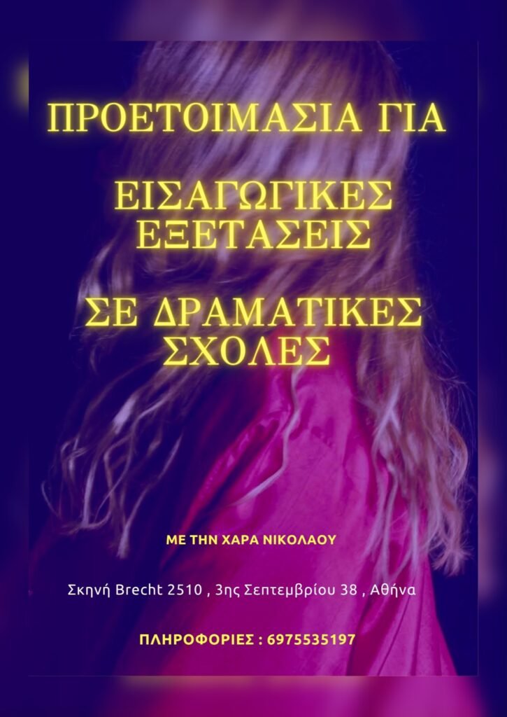 Ιδιαίτερα μαθήματα προετοιμασίας υποψήφιων σπουδαστών Δραματικών Σχολών στη Σκηνή Brecht , 3ης Σεπτεμβρίου 38, Αθήνα Oι υποψήφιοι σπουδαστές θα διδαχθούν την προαπαιτούμενη ύλη για την εισαγωγή τους στις δραματικές σχολές: δυο μονολόγων (κλασικού και σύγχρονου ρεπερτορίου), ενός ποιήματος, αυτοσχεδιασμού, τραγουδιού, Ιστορίας Θεάτρου και Λογοτεχνίας